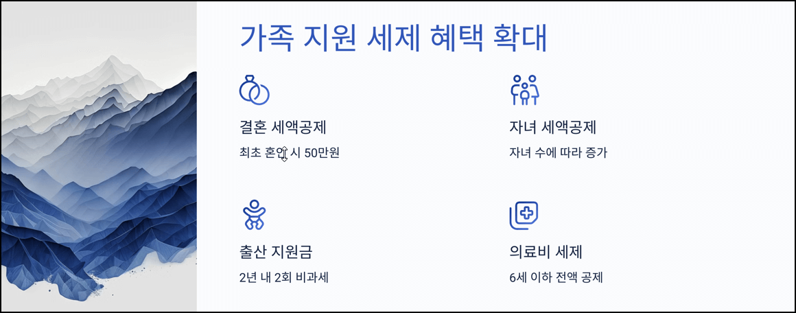 - 의료비 세제 강화: 6세 이하 자녀 의료비 전액 공제 포함.
