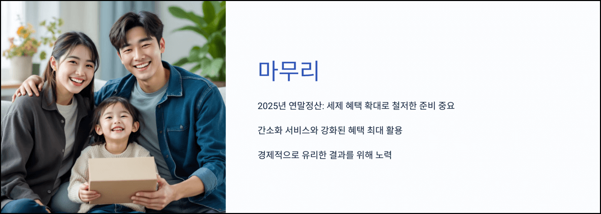 2025년 연말정산은 다양한 세제 혜택이 확대된 만큼 철저한 준비가 중요합니다. 간소화된 서비스와 강화된 혜택을 최대한 활용하여 경제적으로 유리한 결과를 얻으시기 바랍니다.