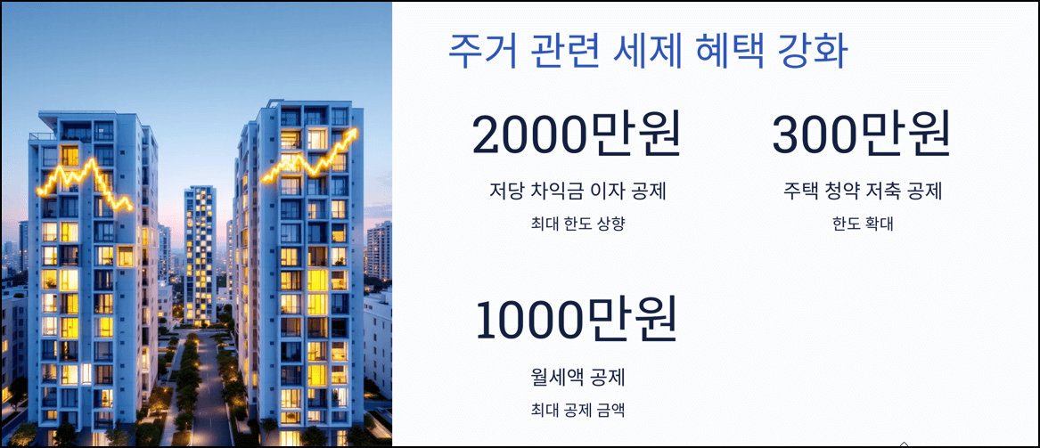 - 주택 청약 종합저축 공제 한도: 기존 240만 원에서 300만 원으로 확대.