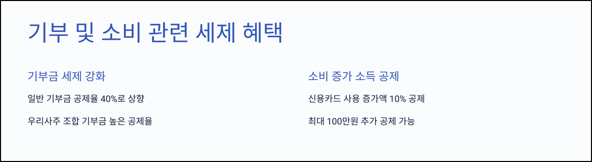 - 기부금 공제율 상향: 일반 기부금의 초과 금액에 대해 기존 30%에서 40%로 공제율 인상.