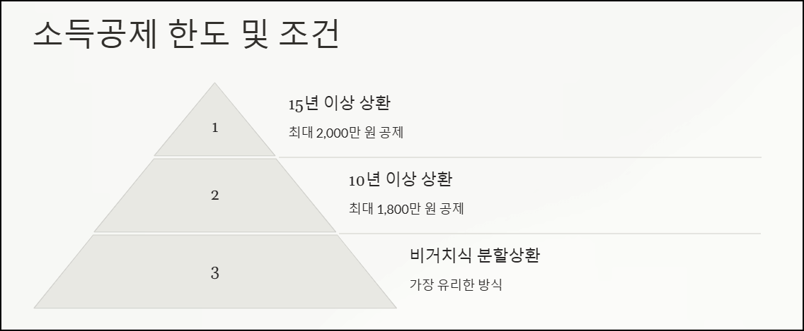- 비거치식, 고정금리 대출이 유리하며, 대환 대출 시 공제 요건에 주의해야 합니다.
