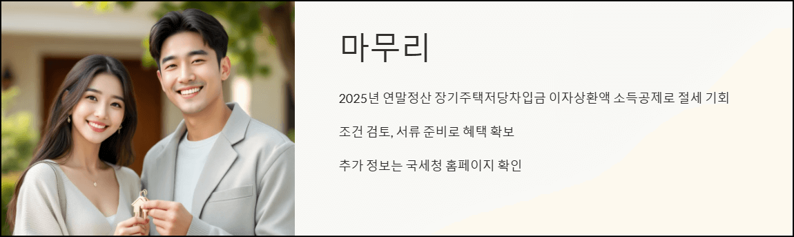 2025년 연말정산에서 장기주택저당차입금 이자상환액 소득공제는 주택을 보유하거나 구매하는 근로소득자에게 절세의 기회를 제공합니다. 주어진 조건과 혜택을 꼼꼼히 검토하고, 필요한 서류를 미리 준비하여 혜택을 놓치지 않도록 하세요.