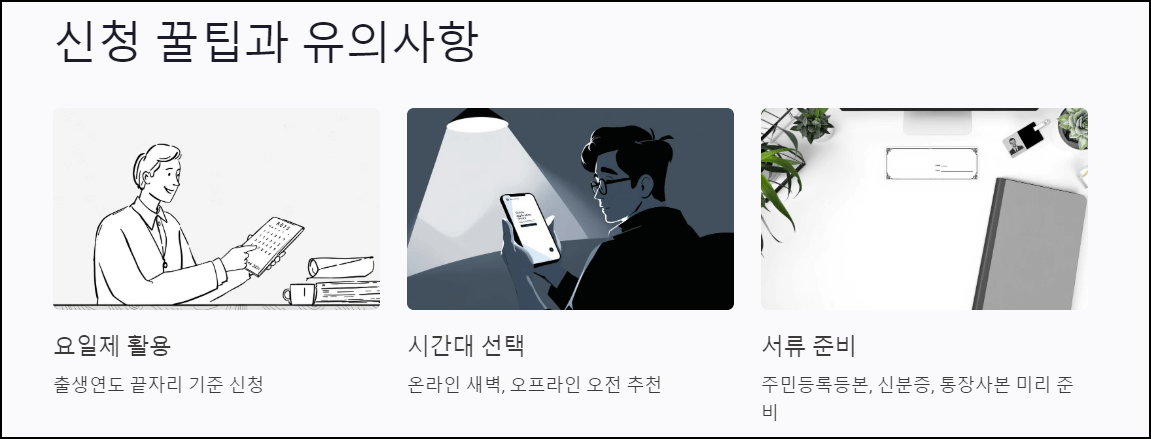 - 새벽 시간대 이용: 온라인 신청 시 새벽(23:00~02:00)을 활용하면 서버 과부하를 피할 수 있습니다.