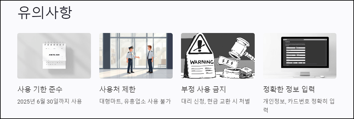 - 부정 사용 금지: 타인 명의로 대리 신청하거나, 현금으로 교환하려는 시도는 법적 처벌 대상이 될 수 있습니다.