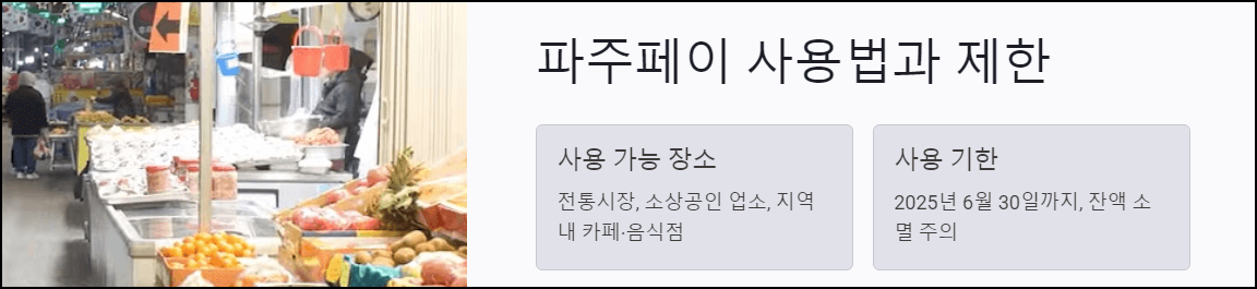 - 사용처 제한: 파주페이는 전통시장, 소상공인 매장 등에서만 사용 가능하며 대형마트, 유흥업소 등에서는 사용할 수 없습니다.